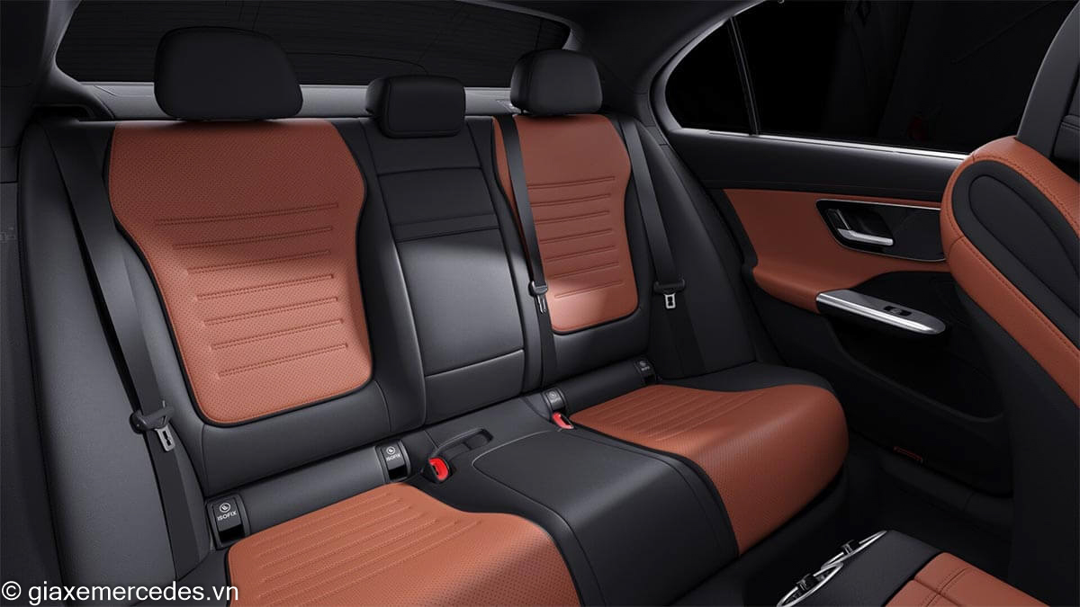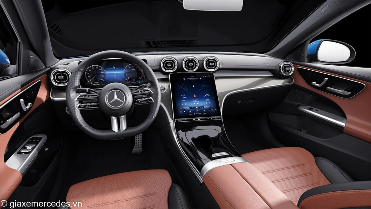 - Ở bên trong, C300 AMG lắp ráp trong nước có thiết kế tương tự bản nhập khẩu, 2 tùy chọn màu nội thất giống nhau là đen và Nâu Sienna. màn hình 12,3 inch sau vô-lăng, màn hình 11,9 inch tại trung tâm khoang cabin giống S-Class. Màn hình này tích hợp MBUX mới nhất, có khả năng kết nối Apple CarPlay/Android Auto không dây. Cửa gió điều hoà mô phỏng tua-bin máy bay được thiết kế bo tròn. Điều hoà tự động và có cửa gió cho khoang sau.